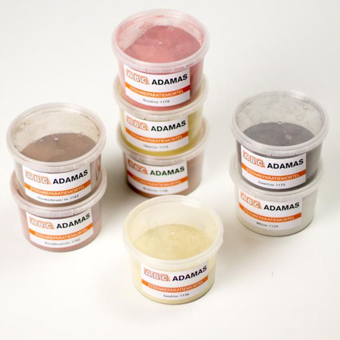 ABC ADAMAS Basisset voor Steenherstel is een set met steenpasta's om gescheurde of beschadigde bakstenen te herstellen. Met de 8 basiskleuren in de set kun je door menging ter plaatse de pasta op de juiste kleur brengen. Het mengsel kun je vervolgens gebruiken om de gescheurde of beschadigde stukken weer dezelfde kleur te geven als de steen zelf. Voor de juiste verwerking van ABC ADAMAS Steenpasta verwijzen we je graag naar de instructievideo onderaan de pagina of naar het tabblad verwerkingsadvies.