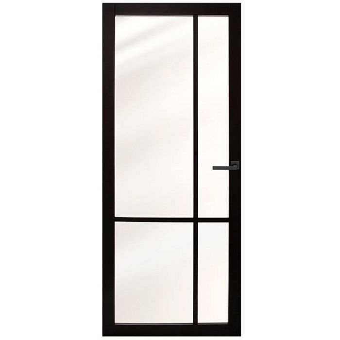 Austria Nero Legno Asti is een zwarte binnendeur met minimalistisch design. Het afgemonteerde blanke glas in combinatie met een ongelijke 4-vlaks roedeverdeling geeft deze deur een unieke uitstraling. Deze deur met industriële look beschikt over stijlen en dorpels van slechts 80 mm. Door deze smalle stijlen is niet al het deurbeslag geschikt. Het Austria Nero Legno deurbeslag is dat wél.