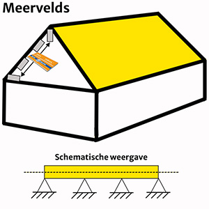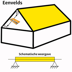 Een eenveldsopstelling betekent dat de dakplaat slechts tussen een muurplaat en de nokgording wordt gelegd. Het heeft twee steunpunten met één enkele overspanning.