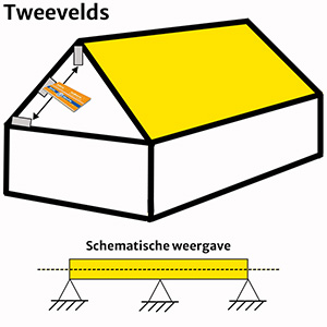 Een tweeveldsopstelling betekent dat de dakplaat tussen een muurplaat, gording en nokgording wordt gelegd. Het heeft drie steunpunten; twee aan de uiteinden en één tussensteun, met twee overspanningen.