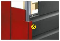Na het plaatsen van de panelen kun je de kunststof afwerkprofielen in het aluminium montageprofiel plaatsen. Gebruik een rubberen hamer voor het aankloppen van deze profielen. De kunststof profielen zorgen voor de afwerking van het geheel. In onderstaande afbeelding zorgt de 2-delige buitenhoek(8), bestaande uit het VinyPlus Montage Buitenhoekprofiel en het VinyPlus Buitenhoekprofiel, voor de afwerking van een hoek.