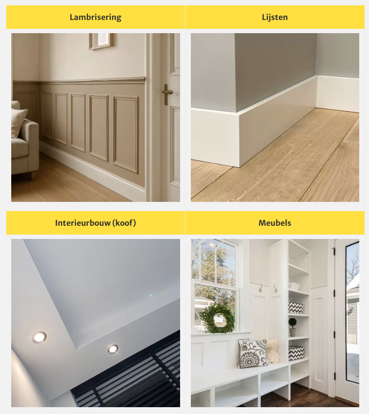 Veelgebruikt voor lijstwerk, deuren, fronten en meubels | |