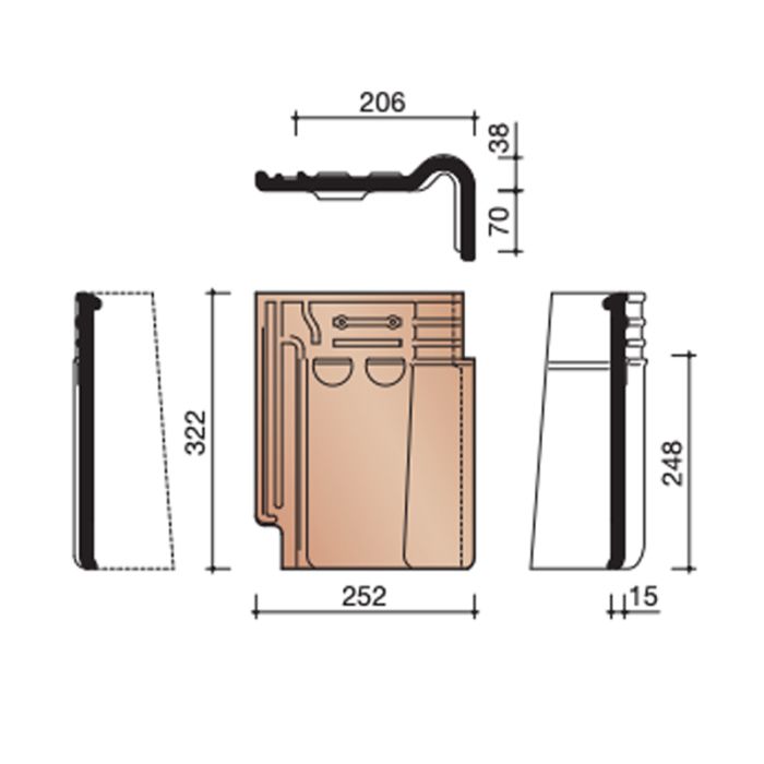 Koramic Tuile Du Nord 993 Gevelpan Rechts (7090) is de pan die aan het einde van het dak, aan de rechterkant, ter plaatse van de gevel, komt te liggen. De pan is qua uiterlijk exact gelijk aan de Tuile Du Nord 993, maar met aan de kant van de gevel een recht deel dat, over de gevel, naar beneden loopt. Een zelfde pan is er uiteraard ook voor de linkerkant van de gevel: Koramic Tuile du Nord 993 Gevelpan Links.
